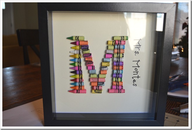 Once all the crayons were cut and dry fitted {for lack of a better word}, I printed the monogram on cardstock and then hot glued each piece and framed it.